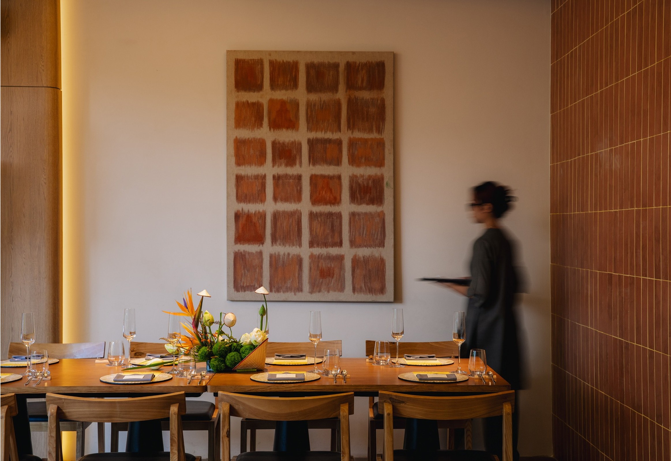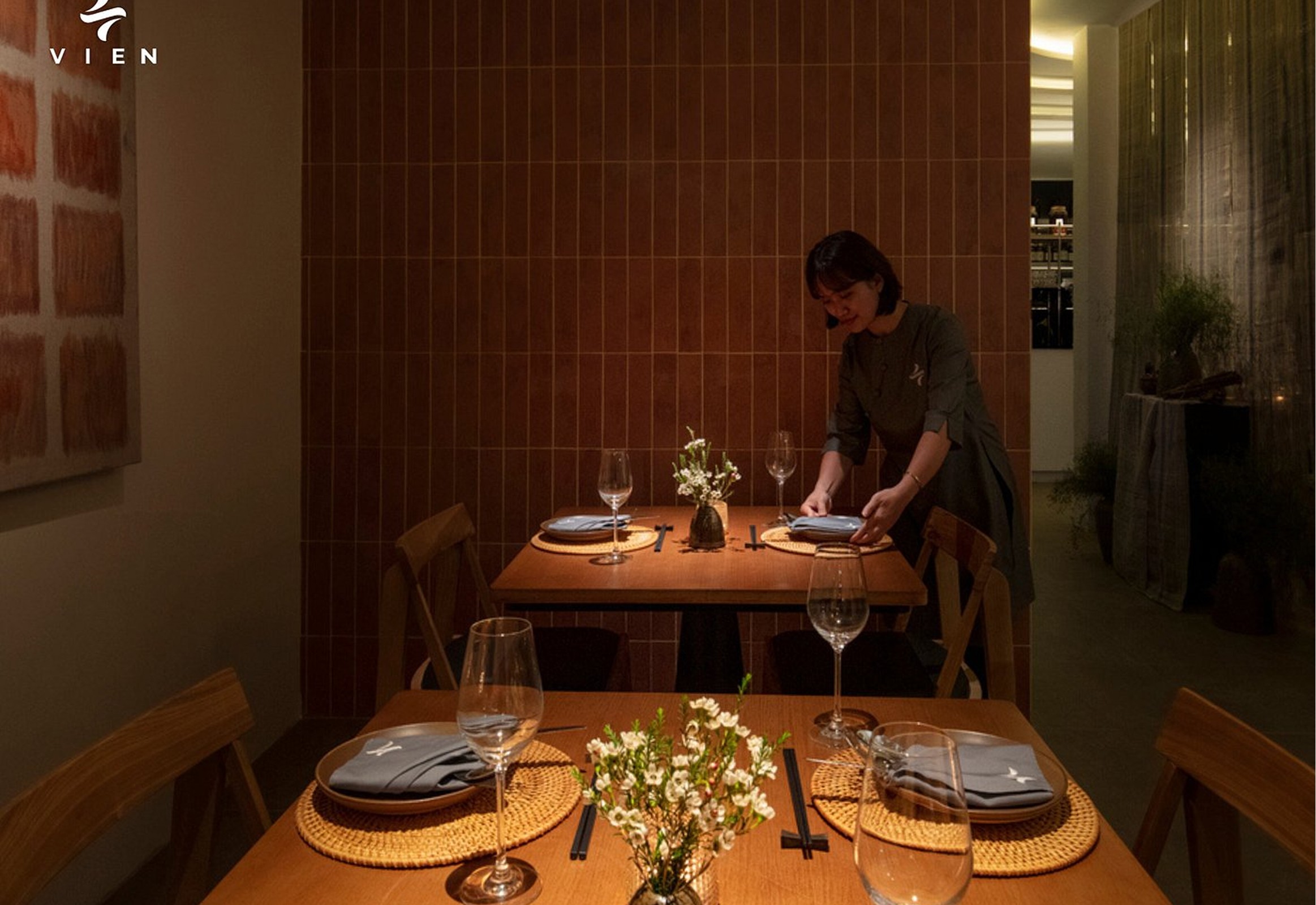 If cuisine connect past and present, then the space is the bridge that completes the journey. At Vien, architecture is more than just a beautiful backdrop — it is an essential part of our identity, where every brick, every tile, and every shaft of light tells a story of meaningful fusion between East and West. From the very first glance, Vien evokes a sense of familiarity with walls clad in terracotta bricks — a material reminiscent of old Hanoi homes, where the passage of time is etched into the raw, rustic texture of each brick. Yet at Vien, these bricks are intentionally arranged, complemented by natural light and minimalist interiors to create a warm, elegant space that blends traditional charm with a touch of contemporary sophistication. Architecture here becomes a catalyst, elevating the dining experience. As you step through Vien’s doors, you are not only savoring a culinary symphony between East and West, but also immersing yourself in a harmony of architecture, light, aromas, and flavors — a symphony that satisfies every sense.